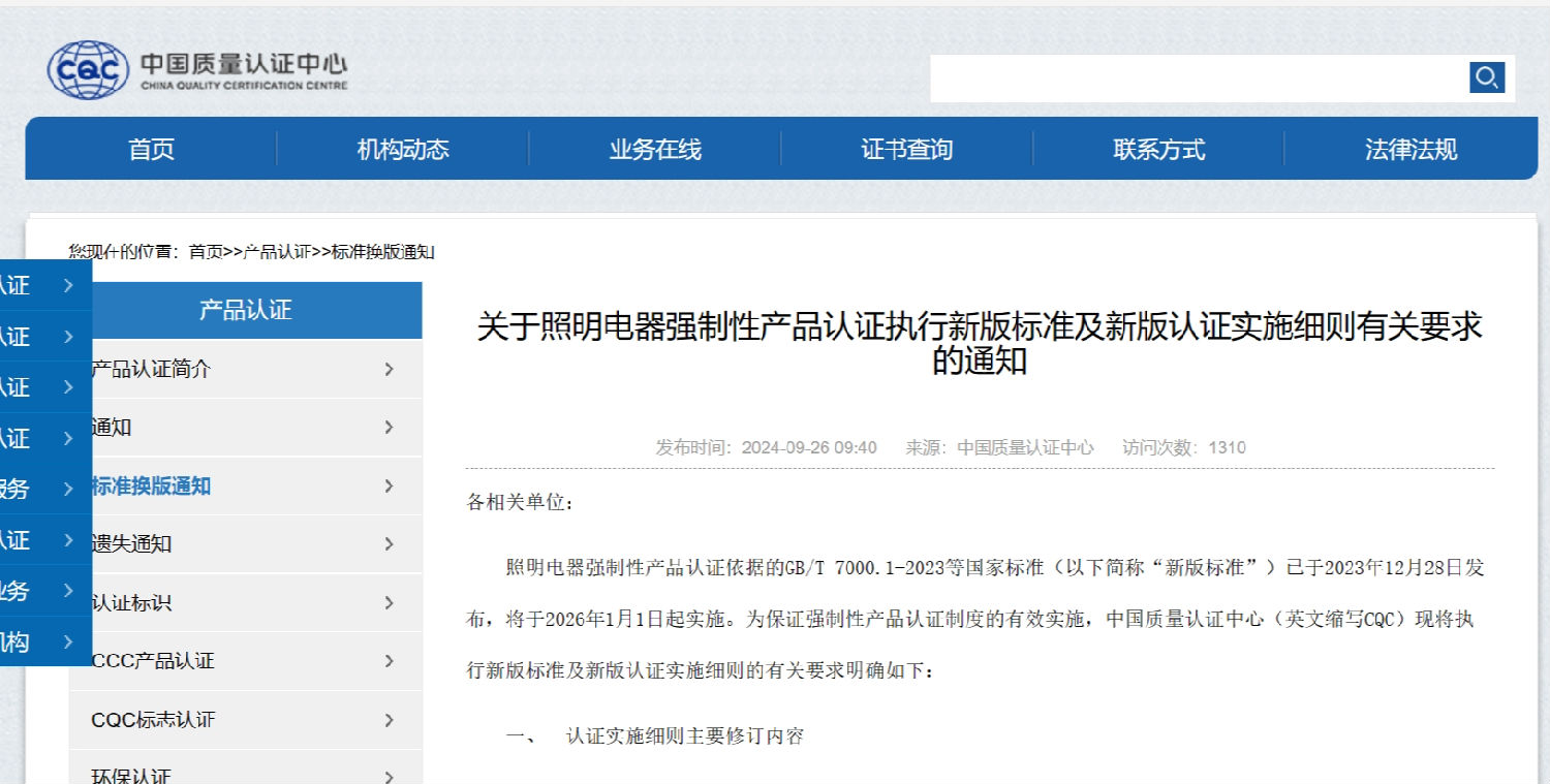 照明電器強(qiáng)制性產(chǎn)品認(rèn)證依據(jù)的GB/T 7000.1-2023等國家標(biāo)準(zhǔn)(以下簡(jiǎn)稱“新版標(biāo)準(zhǔn)”)已于2023年12月28日發(fā)布,將于2026年1月1日起實(shí)施。為保證強(qiáng)制性產(chǎn)品認(rèn)證制度的有效實(shí)施,中國質(zhì)量認(rèn)證中心(英文縮寫CQC)9月26日發(fā)布了《關(guān)于照明電器強(qiáng)制性產(chǎn)品認(rèn)證執(zhí)行新版標(biāo)準(zhǔn)及新版認(rèn)證實(shí)施細(xì)則有關(guān)要求的通知》: