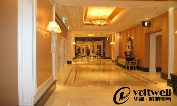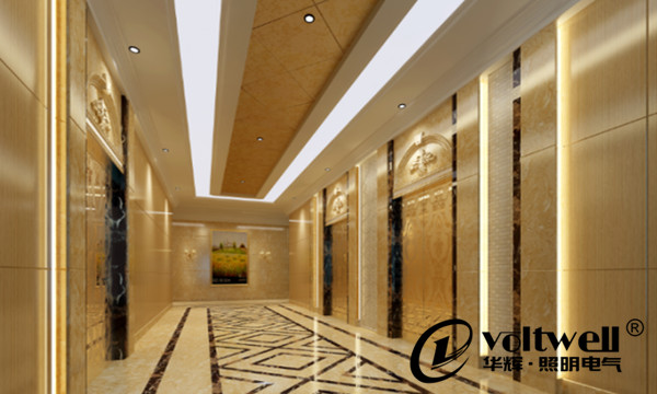 電梯廳照明采用功能性與裝飾性相結(jié)合的照明方式。這里可以選擇寬光筒燈對整體環(huán)境照亮,結(jié)合窄光筒燈或天花燈對電梯口采用重點照明,選用4300K(暖白光)的光源,明亮的光照環(huán)境具有指示的作用,并給顧客帶來安全感。星級酒店為塑造格調(diào)與品位,同時為保證與其他空間的整體性,可增加壁燈、天花暗槽等裝飾性照明方式。