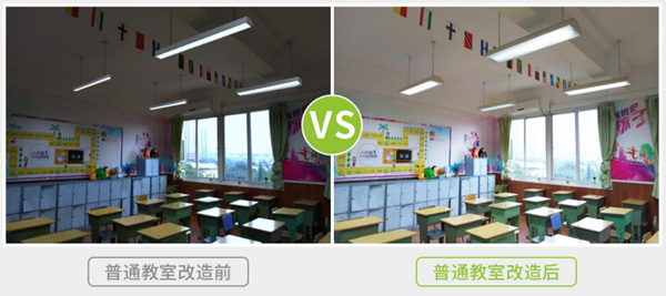 華輝照明通過研發(fā)專門設(shè)計了用于教室照明燈具——led護眼教室燈和led護眼黑板燈,符合國家標準課桌維持平均(恒)照度大于300lx,照度均勻度0.7;黑板維持平均(恒)照度500lx,照度均勻度0.8;顯色指數(shù)大于90,色彩還原性高;采用格柵防眩光設(shè)計,眩光值小于16,不刺眼;色溫是5000K,舒適柔和;教室照度均勻,無頻閃,沒有藍光危害。