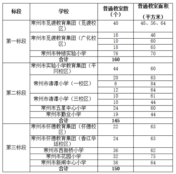 各學(xué)校改造教室數(shù)量及教室面積詳見下表,各標(biāo)段的教室數(shù)量為預(yù)估數(shù),實(shí)際以最終結(jié)算為準(zhǔn)。