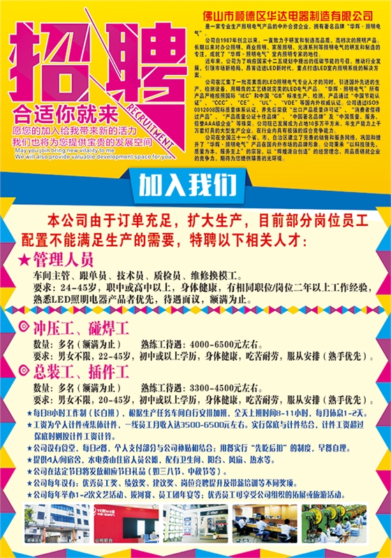 佛山市順德區(qū)華達電器制造有限公司是一家專業(yè)生產(chǎn)室內(nèi)LED照明燈具產(chǎn)品的大型企業(yè),成立于1987年,擁有品牌“華輝•照明電氣”。本公司主要生產(chǎn)LED面板燈、格柵燈盤、燈管支架、LED筒燈、LED射燈等等?,F(xiàn)由于擴大生產(chǎn),訂單充足,目前部分崗位員工配置不能滿足生產(chǎn)的需要,特聘以下相關(guān)人才:管理人員、沖壓工、碰焊工、總裝工、插件工等。