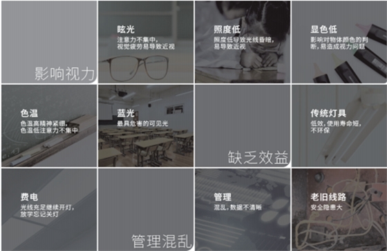 目前,很多教室仍有使用劣質燈具進行照明,燈光刺眼,教室內卻依舊昏暗,學生的課桌照度達不到標準不說,有的熒光燈使用時間長了還會產生噪音和嚴重的頻閃,影響學生的學習效率以及他們的視力健康。