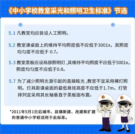 2018年,教育部、國家衛(wèi)生健康委等8部門聯(lián)合印發(fā)《綜合防控兒童青少年近視實(shí)施方案》,明確提出:要為學(xué)生提供符合用眼衛(wèi)生要求的學(xué)習(xí)環(huán)境,嚴(yán)格按照普通中小學(xué)校、中等職業(yè)學(xué)校建設(shè)標(biāo)準(zhǔn),落實(shí)教師、宿舍、圖書館(閱覽室)等采光和照明要求,使用利于視力健康的照明設(shè)備,學(xué)校教室照明衛(wèi)生標(biāo)準(zhǔn)達(dá)標(biāo)率100%。同時《中小學(xué)校采光和照明衛(wèi)生標(biāo)準(zhǔn)》也做出了相關(guān)規(guī)定。